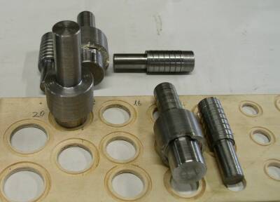 同心円溝掘り工具 穴の周りに溝を掘ってコイルスプリングを入れる必要が出てきた。 かなりの数になるので専用工具を製作。 対応するコイルスプリングは画像の治具(螺旋が切ってある)を使って燐青銅線で作る。 Apr.2008 |
